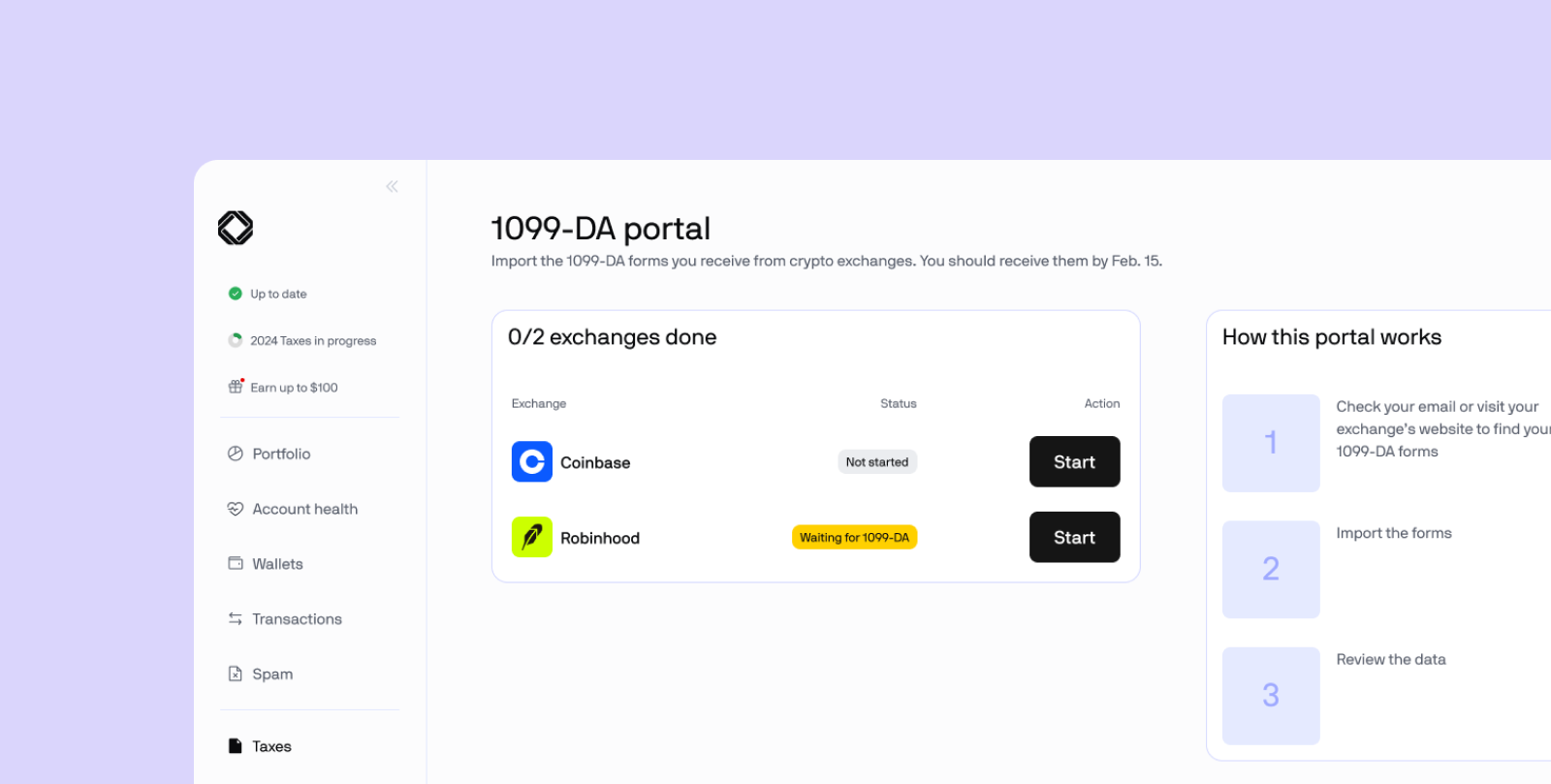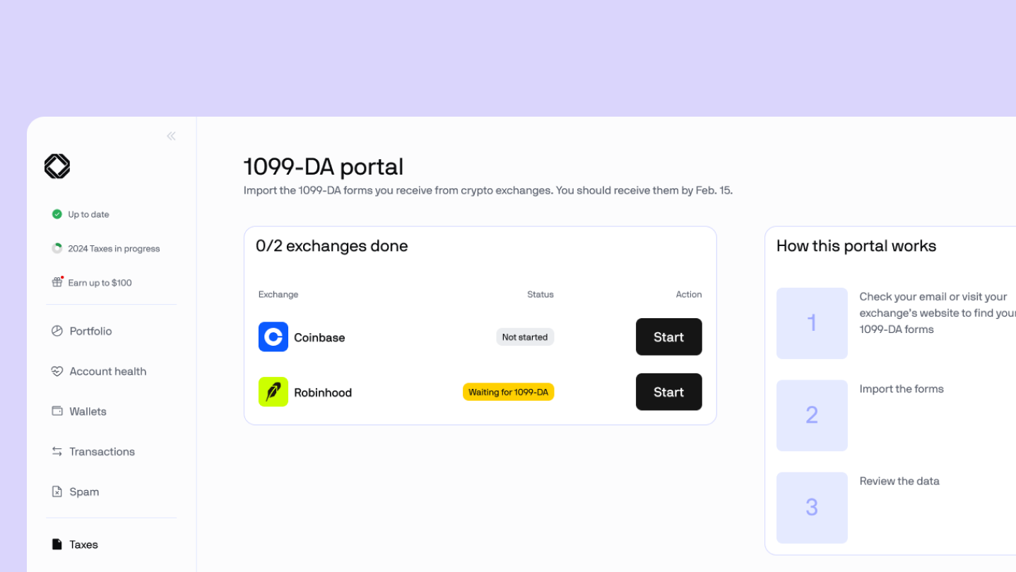- Built around 1099-DAs: Native support for 1099-DA intake and reconciliation, from ingest to export; an entirely new end-to-end tax filing journey, improved transaction and asset views, smarter EVM wallet detection, and clearer tax-year checklists on web and mobile.