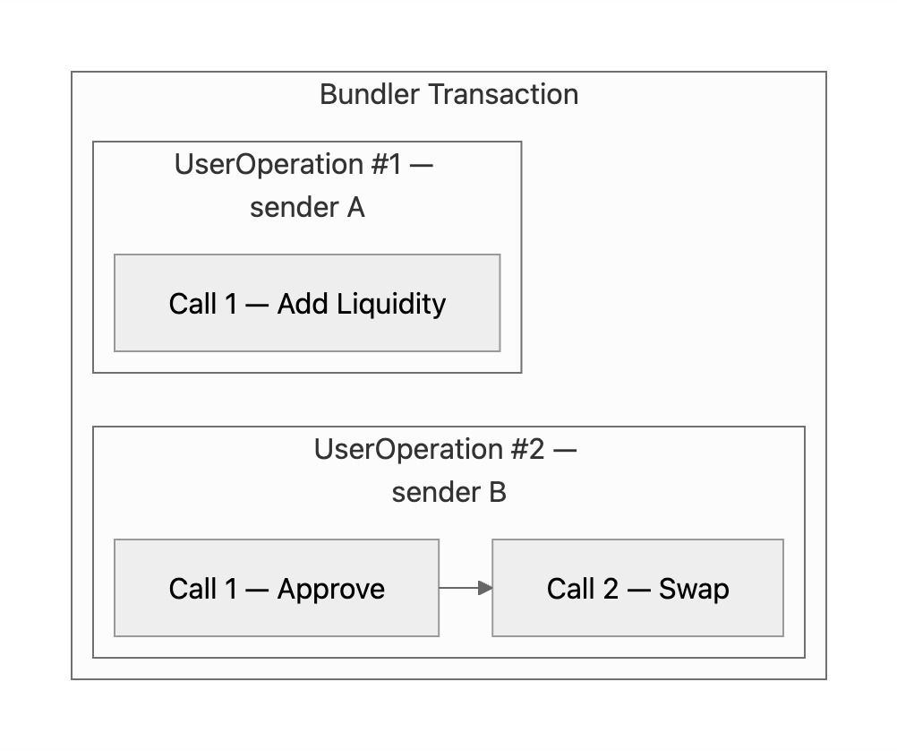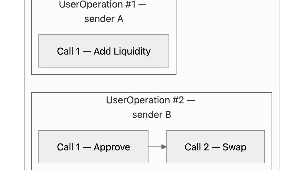 Batches are common. A UserOperation can forward multiple calls in sequence. For example, a swap typically requires an approval followed by the actual swap call. Smart contract accounts implement different forwarding patterns. Examples include execute(address, value, bytes) for single calls, executeBatch(address[], value[], bytes[]) for multiple calls, and various module-based patterns.