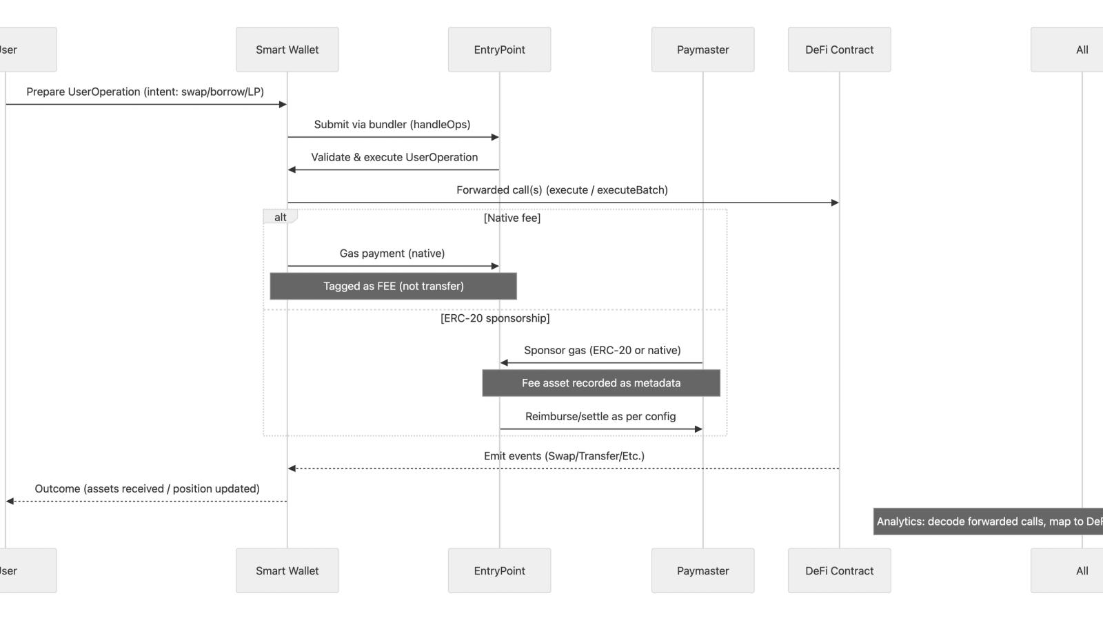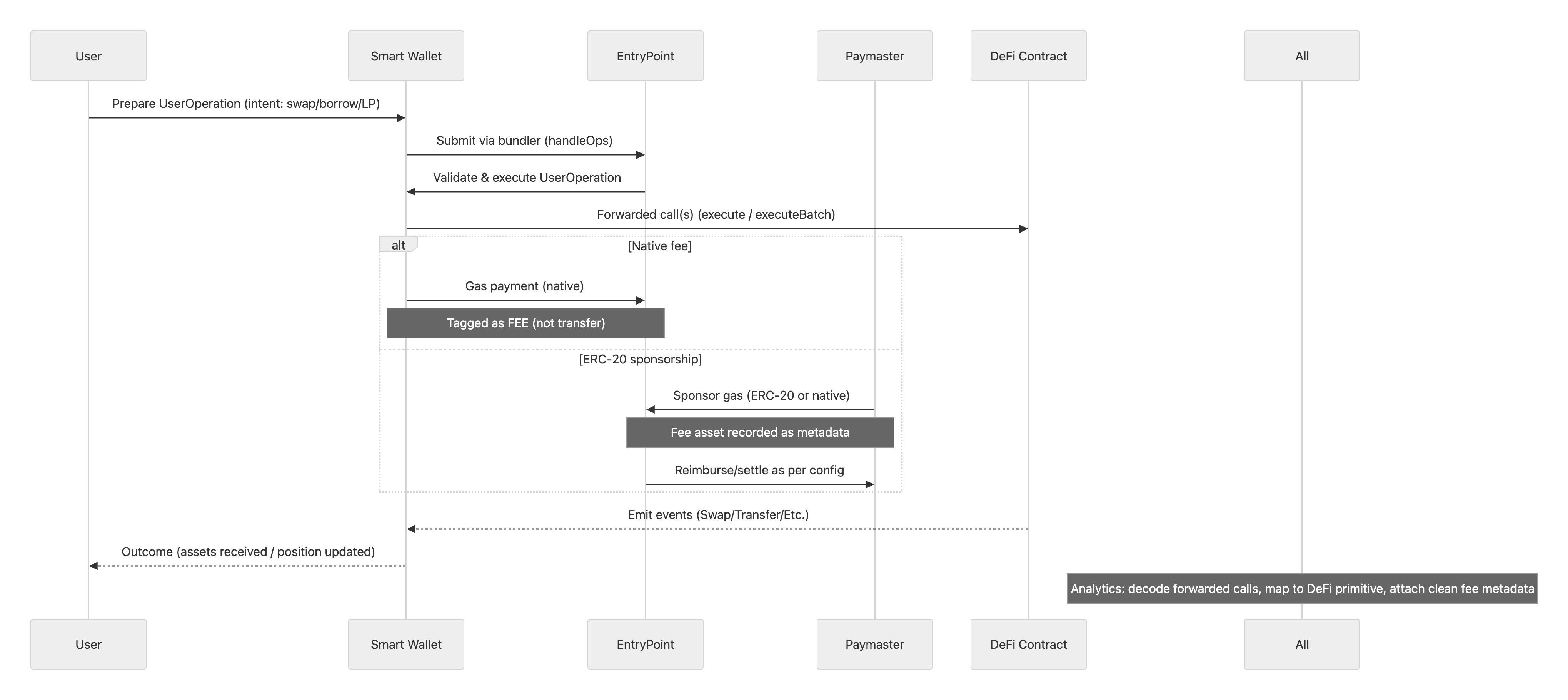 - Our modeling: We tag Paymaster and EntryPoint flows as fees and keep the user-facing fee asset accurate.