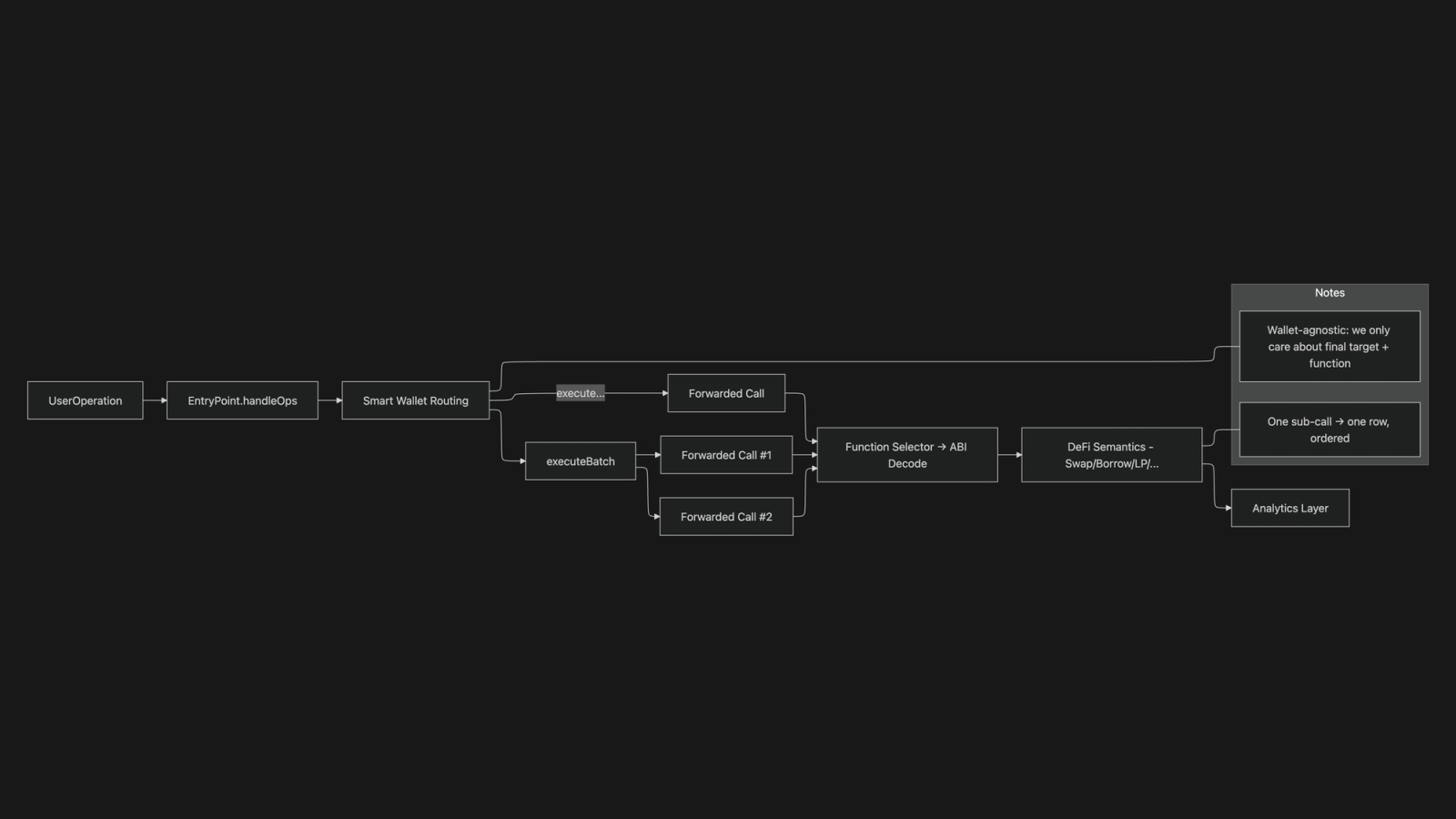We see the EntryPoint as an envelope and read the letter inside. We find out which UserOperations belong to the wallet we are examining, unwrap the forwarded calls, decode each one’s function, and classify the action (swap, borrow, repay, etc.).